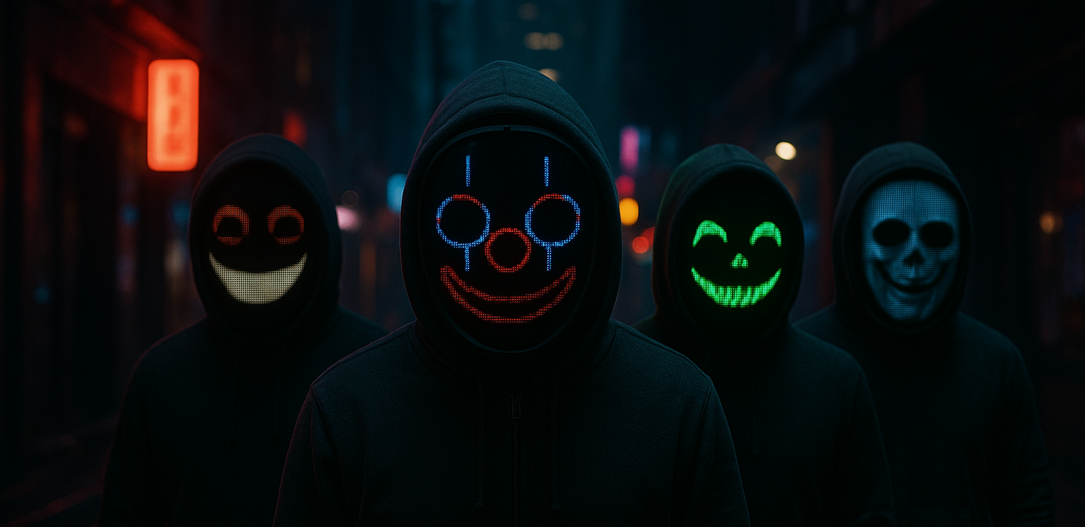 Creamos máscaras LED que combinan arte, tecnología y oscuridad.